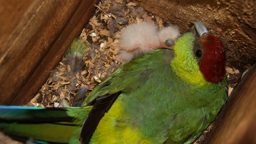 A female Djarrailboredang / Red-capped Parrot broods her small chicks.